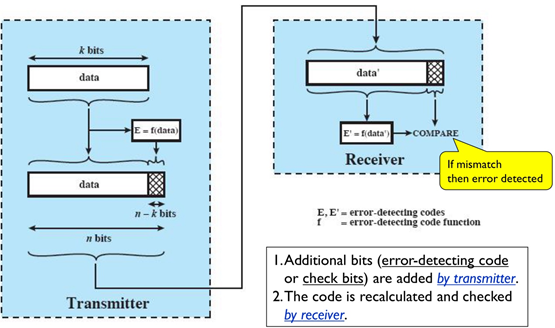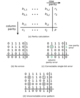 + error bit가 짝수개이면 parity bit로 error을 탐지하지 못한다. parity bit는 1의 홀수, 짝수로 결정하기 때문.