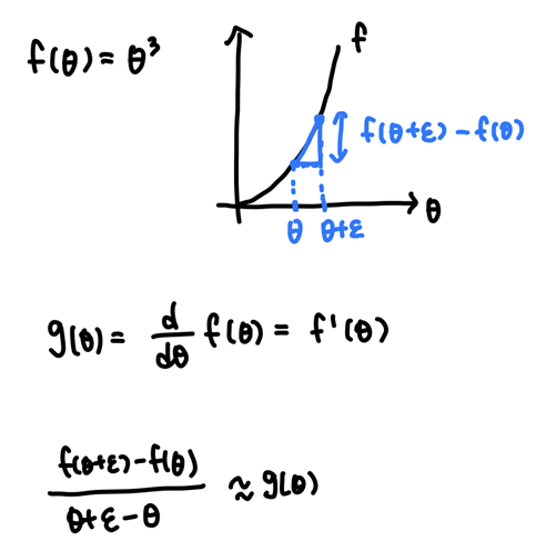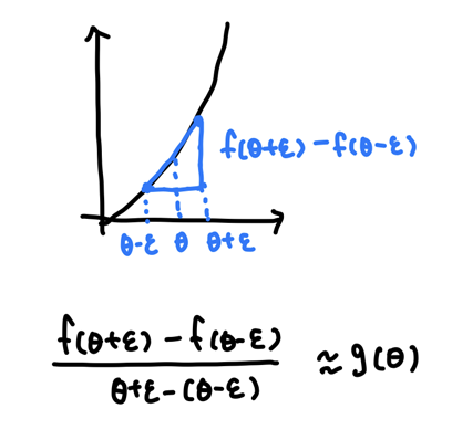 미분 계산이 옳게 되었는지 확인하기 위해 2가지 방법을 사용할 수 있다. 첫 번째 방법은 입력 변수의 값을 아주 조금 늘린 후 증가한 비율을 계산하는 것이다. 두 번째 방법은 입력 변수의 값을 양 옆으로 조금씩 줄이고 늘려서 조금 더 정확한 기울기 값을 계산하는 것이다.