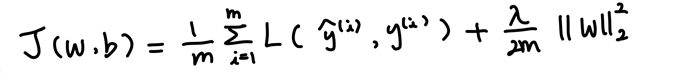 위의 식은 로지스틱 회귀의 비용 함수에 regularization을 추가한 식이다. lambda는 정규화 매개변수이고, 여기서 사용한 regularization은 L2 regularization이다. 참고로 regularization은 w에만 적용을 하는데, w가 차원이 높아 대부분의 매개변수는 w에 속하기 때문이다.