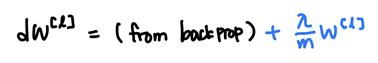 기존의 backprop으로 계산한 dw에 regularization으로 인한 해당 식이 추가되는데, 이러한 이유로 경사하강을 진행할 때 w는 regularization을 하지 않았을 때보다 더 작아지는 효과를 가지게 된다. 그래서 L2 regularization을 "weight decay"라고도 한다.