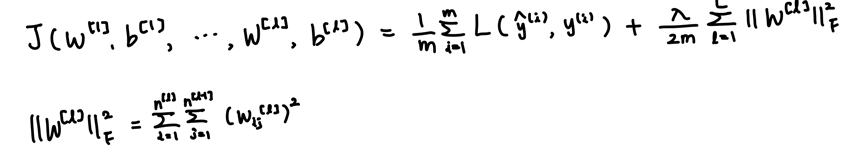 위의 식은 신경망의 비용함수에서 regularization을 추가한 식이다. L2 정규화 방식을 추가하였고, 여기서는 ||W[l]||^2를 "Frobenius norm"이라고 부른다.