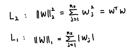위의 두 식은 각각 L2와 L1을 나타낸다. L2는 모든 유닛의 영향을 조금씩 줄이는 역할을 하지만, L1은 많은 w를 0으로 만들어 모델을 압축하는 효과를 낸다. 그렇기 때문에 L1는 거의 사용하지 않고, L2를 많이 사용한다.