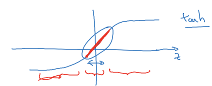 위의 내용을 tanh 그래프에 적용하여 조금 다른 방식으로 이해해 볼 수도 있다. L2 regularization으로 w 값(크기)이 줄어들고 따라서 z의 값이 원점에 가까운 값이 된다. tanh는 원점 지점에서 선형 함수와 비슷한 양상을 띄는데, 이 과정이 모든 layer에서 반복되면 전체 네트워크도 선형 네트워크가 되는 효과가 발생한다. 그러면 비선형 네트워크보다 조금 덜 복잡한 패턴을 학습하게 되며 오버피팅도 점점 줄어들 것이다.