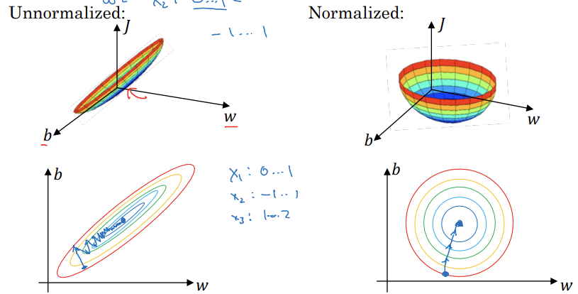 normalize를 시키면 input 값들이 비슷한 범위를 가지게 되면서 경사 하강이 왔다갔다하는 현상 없이 잘 작동하게 된다. 아래는 이를 그림으로 표현한 자료다.