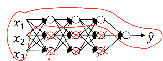 regularization 과정이 오버피팅을 줄이는 원리에 대해 알아보자. 간단한 신경망을 그려 직관적으로 이해해보면 다음과 같은 그림으로 표현할 수 있다.