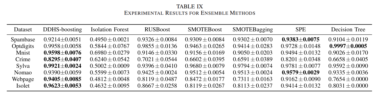 - DDHS는 13 dataset에서 다른 고전 방법, sota 방법과 비교했을 때 유망하고 안정적인 결과를 보였다. 그리고 이 방법은 저차원, 고차원 dataset 모두에서 좋은 성능을 보여 주었다. DDHS는 데이터 수준의 알고리즘이고 이를 boosting 기술을 결합하여 DDHS-boosting 도 개발하였는데, 이것은 다른 앙상블 방법과 비교하였을 때 아주 좋은 결과가 나타났다.